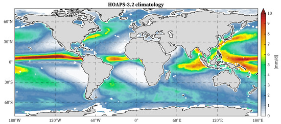 A statistical neuronal network algorithm is used to derive precipitation data from satellite-based passive microwave imagers. The data that have been used here are based on the HOAPS-3.2 dataset [20,21,22,23]. This version of HOAPS is provided and distributed by the Satellite Application Facility on Climate Monitoring (CM SAF). The HOAPS dataset itself uses brightness temperatures (BT) from SSM/I. This is explained in detail in [22,24]. The algorithm is applied over ice-free ocean and 50 km off coasts. Figure 3 shows a spatial map of the HOAPS-3.2 precipitation climatology. Verification results of the HOAPS dataset can be found in [22,23], and references therein. For the global precipitation product, HOAPS-3.2 was enhanced by using additional TRMM microwave imager BT data available for 1997 and later. This increases the temporal sampling per region due to the additional instrument overpasses for the respective time range. Thus, the HOAPS rain rate retrieval algorithm was adapted accordingly to allow the processing of TMI data.