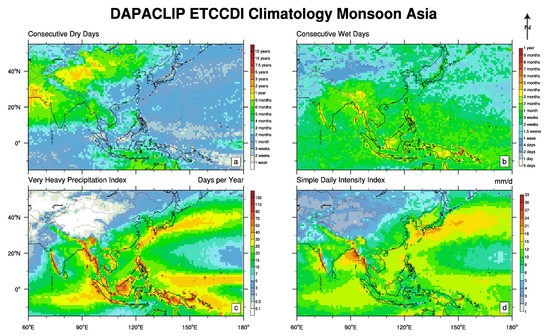 DAPACLIP ETCCDI climatology for the period 1988–2008 for the region of Monsoon Asia in 1.0° spatial resolution for selected ETCCDI indices. Panel (a): cdd index. Panel (b): cwd index. Panel (c): r20 index. Panel (d): sdii index.