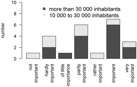 The perceived importance of climate change adaptation varied in the municipalities in Baden-Wuerttemberg. While 10 of 23 municipalities that responded to the questionnaire consider the topic to be “important” or “very important” in their municipality, six rated it as “not important,” “hardly important,” or “of little importance”. In general, climate change adaptation seemed to be more important in larger than in smaller municipalities (Figure 2).