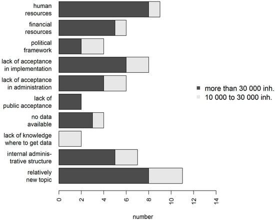 Although many municipalities would like to consider climate change in decision-making routines more effectively (14 municipalities chose “stronger” or “much stronger” in answering this question), they mentioned various barriers to doing so (Figure 3). One barrier reported by nearly half of the municipalities is that the topic is relatively new for local administrations. There also are major barriers of an internal nature, including personnel resources, the internal administrative structure, and lack of acceptance on the part of the administration itself. We also concluded from the answers to the open-ended questions that, although municipalities often regard climate adaptation as an important side issue, it covers several fields of action that require additional coordination that often is unavailable. In addition, some municipalities reported a “lack of acceptance in implementation of adaptation measures”. With this answer option, we intended to address the possible barrier of a perceived lack of acceptance when measures are implemented, e.g., acceptance by parties involved or affected by measures concerning urban planning or construction plans (“lack of acceptance in implementation” in Figure 3). With respect to data accessibility, a quarter of the municipalities complained that they lacked availability to data and/or, did not know where to obtain them.