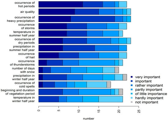 The climate parameters that were deduced from experts’ experiences were related either to one or more climate variables (e.g., temperature, precipitation). In addition to frequencies of occurrence, durations of certain weather situations are important. These parameters affect people (for example, high temperatures) and influence capital investments or municipal budgets (for example, winter services). Furthermore, the occurrence of events that climate parameters describe can cause property damage (heavy precipitation events, storms) or health risks (heat waves, high pollen levels). For example, knowledge about the direction and intensity of climate change can support decisions in urban planning, although further investigations might be necessary before taking concrete measures. The evaluation of tailored climate parameters for past periods also could underpin municipalities’ previous experiences of climate change (for example “we have observed an increasing number of dry periods”). However, some climate parameters desired describe effects of weather events. Such parameters, e.g., flash floods in cities due to heavy precipitation or river flooding, cannot be assessed directly with regional climate models, but require coupling to impact models. Air quality assessments are available already from weather forecasting model data [68,69], but are not yet available widely from climate models for long periods.