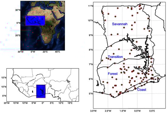 The map showing location of Ghana, its ecological zones, and the GMet rainfall measurement locations across the country.