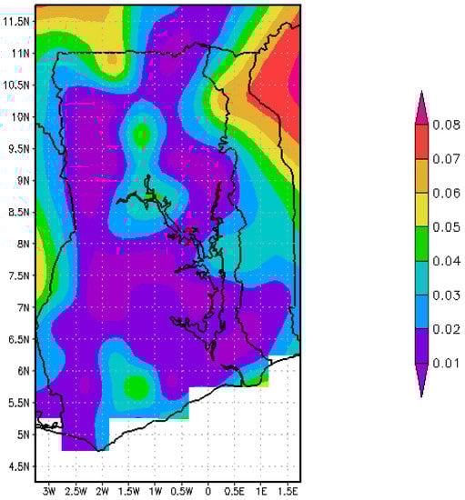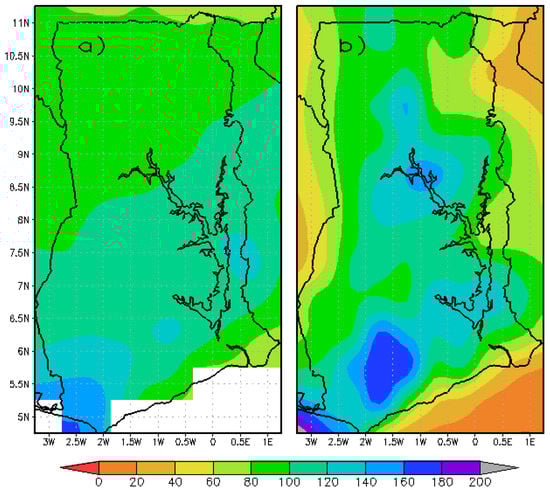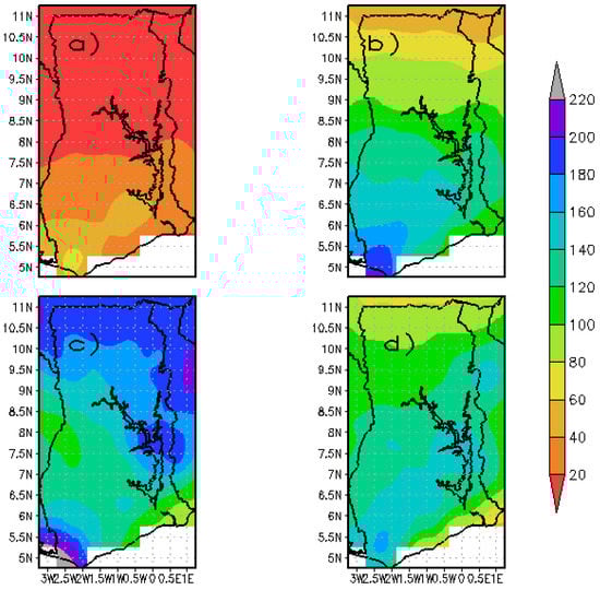 The March–April–May (MAM) season happens to be the rainfall onset period for most parts of the country. Rainfall values begin to increase from about 60 mm in the north to as high as 200 mm in the south, especially towards the southwestern part of the country. This is shown in Figure 9b) and can also be found in [30,51].