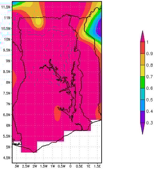 The Pearson’s correlation coefficient was computed between the two datasets for each grid over the entire country in order to determine the strength of the association between them. A high correlation coefficient of 0.9 to 1 was obtained almost all over the country except for some small portion of the upper west region which gave correlation coefficients between 0.7–0.9 (Figure 4). This results indicate a good agreement in the temporal course of the precipitation with some some few limitations in the spatial distribution. To obtain the difference between the two datasets, the RMD is also computed.