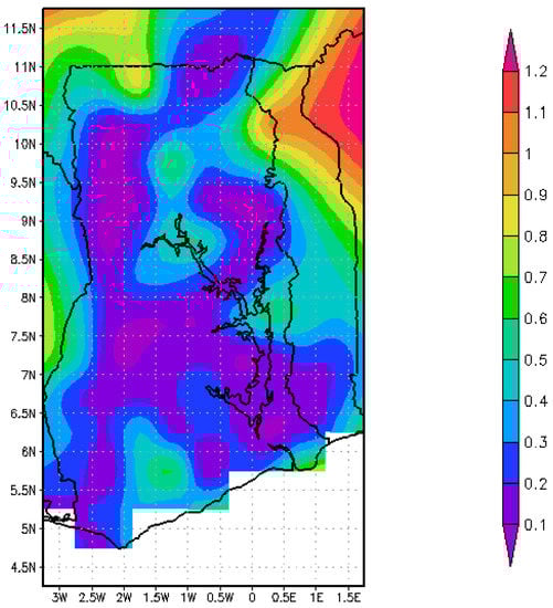 The September–October–November season is known as the minor rainy season for the southern part of Ghana. Rainfall amounts vary between 100 and 180 mm for the southern and the lower portions of the north. The upper parts of the north and the east coastal regions however experience a relatively lower rainfall between 40 and 100 mm (Figure 9d). During this season, the St. Helena High pressure system begins to weaken. The strength of the Monsoon winds therefore begins to weaken. The ITD begins to return and hence resulting in this minor rainy season [30,51].