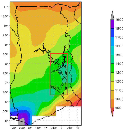 Mean annual total rainfall (mm) over Ghana for the period 1901–2010. Location of the Volta basin indicated by the red rectangle.