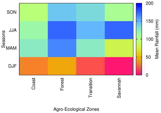 Seasonal mean rainfall amounts over the agro-ecological zones of Ghana.