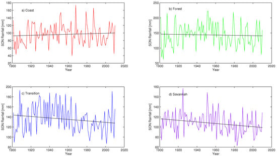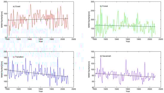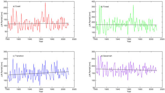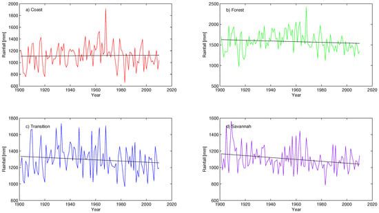 The results indicate below normal rainfall amounts observed between the 1901–1920 and 1980–2010 periods for all the agro-ecological zones except for the Savannah which shows above normal rainfall values within the 1901–1940 period (Figure 11). Likewise, above normal rainfall values are recorded between 1930–1980 for all the agro-ecological zones. The Savannah Zone however shows a break at around 1950 where a significant lower than normal rainfall value is recorded.