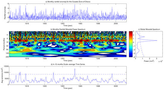 (a) Monthly Rainfall Anomaly in the Savannah Zone for the 1901–2010 period. (b) Wavelet Power Spectrum for the Savannah Zone. Cross-hatched region is the cone of influence. (c) The global wavelet power spectrum. The dashed line is the 5% significance level for the global wavelet spectrum; and (d) Scale-average wavelet power over the 8-16 months band. The dashed line is the 95% confidence.
