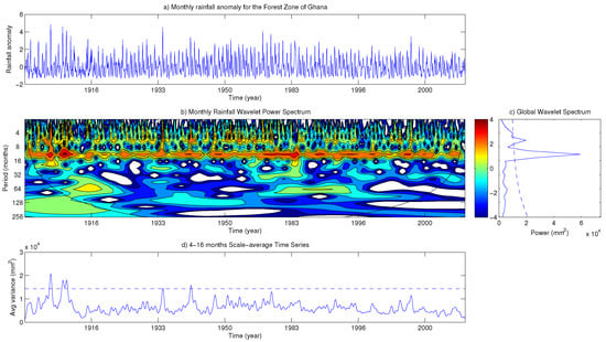 (a) Monthly Rainfall Anomaly in the Forest Zone for the 1901–2010 period. (b) Wavelet Power Spectrum for the Forest Zone. Cross-hatched region is the cone of influence. (c) The global wavelet power spectrum. The dashed line is the 5% significance level for the global wavelet spectrum; and (d) Scale-average wavelet power over the 4–16 months band. The dashed line is the 95% confidence.