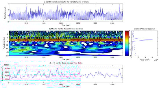 (a) Monthly Rainfall Anomaly in the Transition Zone for the 1901–2010 period. (b) Wavelet Power Spectrum for the Transition Zone. Cross-hatched region is the cone of influence; (c) The global wavelet power spectrum. The dashed line is the 5% significance level for the global wavelet spectrum; and (d) Scale-average wavelet power over the 4–16 months band. The dashed line is the 95% confidence.