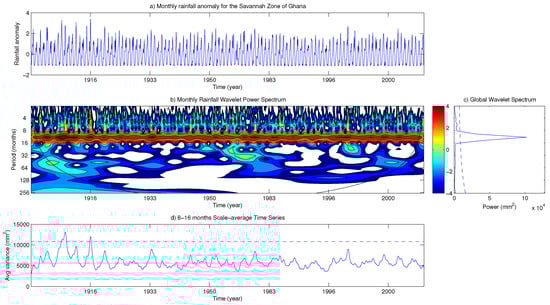 The result of the wavelet analysis for the Savannah Zone of Ghana is presented in Figure 20. In Figure 20b wavelet power for the monthly rainfall anomaly at the Savannah Zone (Figure 20a) of Ghana is shown. A very strong annual signal is seen between the 8–16 month band. This occurs consistently throughout the entire time series with periods of very wet years occurring around 1904–1905, 1907–1910, 1916, 1933, 1960, 1984–1986. No dry periods are identified within the Savannah Zone. Like all the previous agro-ecological zones no significant information was obtained for low frequency periods (32–256 months scale).