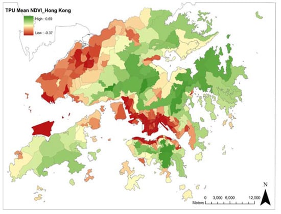 We chose to use the Normalized Difference Vegetation Indicator (NDVI) [22] to measure green space coverage. We obtained the NDVI for the year 2006 from a Landsat satellite image taken on 4 December 2006, at 30 m resolution. As most of vegetation in Hong Kong is evergreen, the NDVI is not expected to vary much seasonally. The NDVI is a simple numeric indicator derived from a ratio of the visible wavebands to assess the amount and density of green vegetation within the target area being observed. The ‘mean’ value is the spatial averaged NDVI for each TPU. The following are the threshold values of NDVI from the Hong Kong Planning Department [23]: NDVI < −0.1: urban/bare soil NDVI > −0.1: vegetation NDVI > 0.6: tree −0.1 < NDVI < 0.6: grass. Since green space coverage has not changed dramatically in Hong Kong in recent years, we assumed that the NDVI index remained constant during that study period. The map below shows the distribution of green space coverage in Hong Kong (see Figure 1). The mean NDVI was calculated at the TPU-level using ArcGIS software. For grid cells that overlapped, more than one TPU weighted averaging was performed using the Mosaic function in ArcGIS. Although some individual grids had NDVI values as high as 1.0, the maximum average value for an individual TPU was 0.57, as all TPUs had some non-green areas.