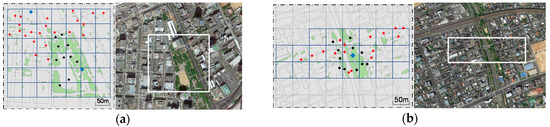 Mobile measurements were carried out in Higashi-yuen Park (about 2.7 ha, green coverage rate, which is the ratio of the canopy area to the park area: about 45%) and a neighboring business area at 13:00 and 17:00 on 2 August 2012, in Ishiyagawa Park (about 4 ha, green coverage ratio: about 42%) and a residential area at 13:00 and 17:00 on 4 August 2012, and in Okurayama Park (about 7.9 ha, green coverage ratio: about 70%) and a residential area at 13:00 and 17:00 on 8 August 2012. These parks are all located in Kobe city, Japan. Mobile measurement points and aerial photographs are shown in Figure 1. The grid lines are spaced 50 m apart. The green color indicates green coverage.