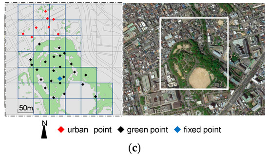 Mobile measurement points and aerial photograph, all located in Kobe city, Japan. (a) Higashi-yuen Park and business area; (b) Ishiyagawa Park and residential area; (c) Okurayama Park and residential area.