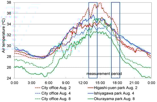 The elements measured are air temperature, wind direction, wind velocity at a height of 1.5 m, and surface temperature. The measuring device and method are shown in Table 1. Wind velocity was sampled every second at each mobile measurement point which is indicated as an urban point and green point in Figure 1 and the averaged value for 30 s was recorded. Wind direction was recorded based on the direction with the highest frequency in the 30 s. Measurement results for air temperature at the fixed measurement points are shown in Figure 2. It was continuously measured only at fixed points. Thermistor sensors were installed in a natural ventilation-type solar radiation shielding device and were set on the roof of the Kobe City Hall No. 3 building (47 m above the ground, flat concrete roof with the usual waterproof sheet finish) and the trunks of trees in the Higashi-yuen Park, Ishiyagawa Park, and Okurayama Park (3 m above the ground). Kobe City Hall and Higashi-yuen Park are close to each other. The distances from Ishiyagawa Park and Okurayama Park to Kobe City Hall are about 5.7 km and 2.1 km, respectively.