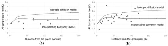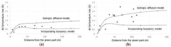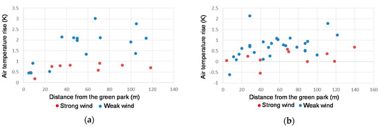 Calculation results and measurement results of air temperature rise at 13:00 according to the distance from the green area. (a) strong wind case; (b) weak wind case.