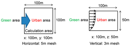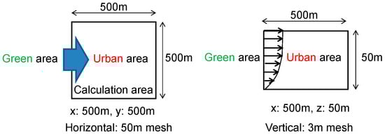 In order to discuss this in more detail, a recalculation was carried out, improving the spatial resolution in the urban area near the green area. An outline of the modified calculation conditions is shown in Figure 10. The horizontal mesh size was changed to 5 m from 50 m as in the above calculation. The other calculation conditions were not changed.