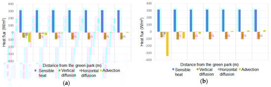 Distance from the green area and heat flux component of the calculation result at 13:00. (a) isotropic diffusion model; (b) incorporating buoyancy model.