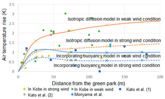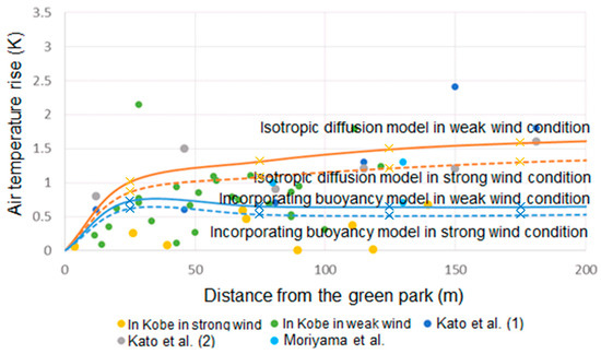 In addition to the measurement results in Kobe City, the calculation results in Figure 8 and Figure 9 were also compared to the measurement results in the urban area around Koishikawa park in Tokyo by Kato et al. [9], and several parks in Osaka city by Moriyama et al. [10]. In the results measured in Tokyo and Osaka, air temperature does not rise as it enters the part of the urban area more than 50 m from the green area. On the other hand, Honjo and Takakura [2] explained that the range of the effects of urban green areas extends to about 100 to 300 m into the surrounding urban area. Since they used the isotropic diffusion model, it is recognized that it was a finding only in the case of weak wind.