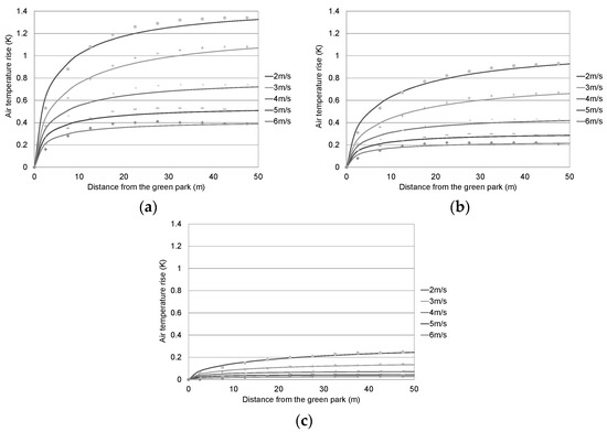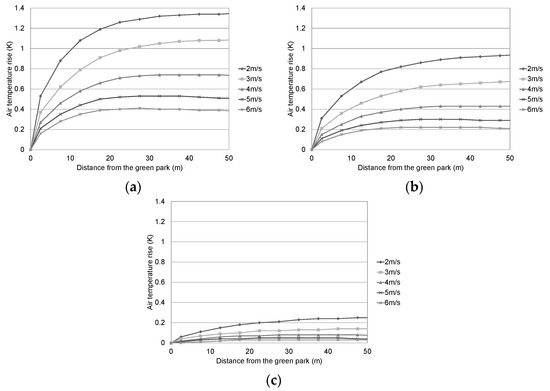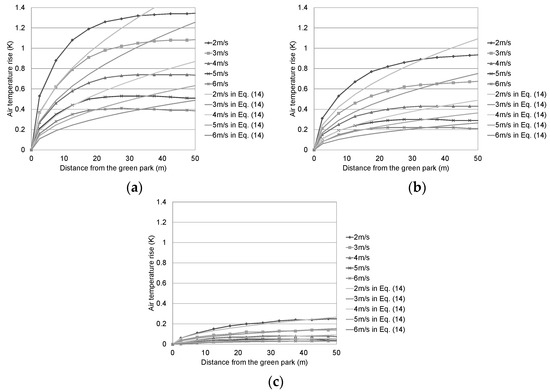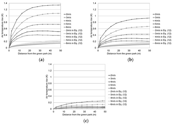 Calculation results of air temperature rise according to the distance from the green area. In the cases where the sensible heat flux is (a) 236.7 W/m2; (b) 132.5 W/m2; (c) 28.3 W/m2.