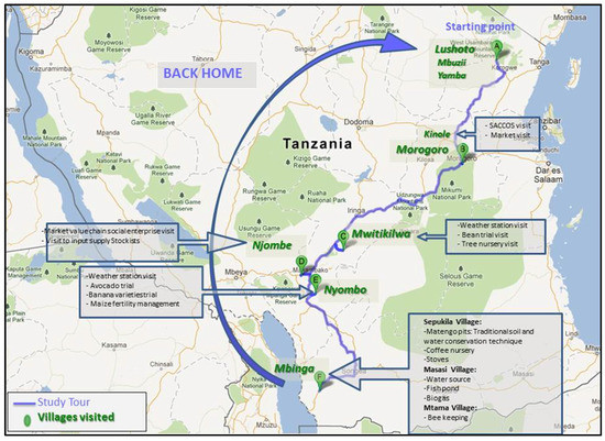 Fifteen farmers from two villages (Yamba and Mbuzii), including both men and women, and five key agricultural innovation systems (AIS) stakeholders from Lushoto took part in a 10-day learning journey to several sites including Morogoro, Mufindi, Njombe, and Mbinga in the Southern Highlands (see Figure 2). AIS stakeholders are partners with a vested interest in addressing a common problem and identifying solutions that are technically feasible, socio-culturally, and economically acceptable [23,24,25,26]. The farmers were selected based on a criteria developed by the community that included gender balance, different ages, farmers involved in CCAFS activities, and who had been interviewed during the CCAFS baseline survey [27]. The AIS actors were drawn from different economic sectors including tourism, agricultural input dealers, community development organizations, and the agricultural and livestock sectors.