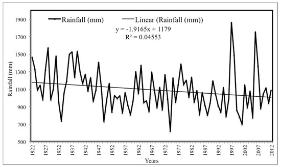 Lushoto long-term annual rainfall trend (1922–2012).