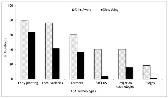 The findings indicate that there was a high correlation between awareness and use of the CSA technologies. Of the CSA technologies that farmers were aware of—improved crop varieties, composting, cut and carry feeding, use of inorganic fertilizers, agroforestry, and early crop planting—were the most commonly used by the farmers (Table 4). Biogas for efficient energy use and improved cooking stoves reduces GHG emissions. Waste from animals used in biogas equipment for anaerobic digestion can provide solutions to energy supply for cooking and lighting in Lushoto, and the byproduct as agricultural fertilizer [53,54,55]. Despite biogas technology utilizing energy sources without depleting natural resources and are as environmentally benign as possible, investment costs for farmers in Lushoto are very high, thus limiting their adoption. Matengo pits for water conservation and involvement in SACCOs were the other two practices least used by the farmers.