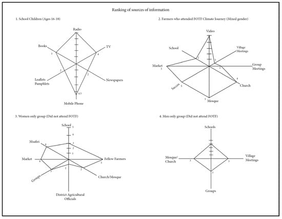 Farmers were asked about the practical CSA information dissemination pathways that can be used to reach the majority of farmers, especially women and other disadvantaged groups. Understanding dissemination pathways involves considering horizontal (peer-to-peer through face to face interactions, word of mouth, farmer meetings) and vertical (upwards and downwards amongst farmers, extension providers, researcher to farmer, and use of radios or cellphones) pathways [66]. Decisions on which dissemination pathway to use depend on farmers’ skills, needs, and resources to receive and use the information [67,68]. We used FGDs and cobweb mapping exercises to enable farmers to visually map the different CSA dissemination pathways. The FGDs generated a simple checklist of critical stakeholders that are considered important sources of information. Afterwards, cobweb networks diagrams were drawn by FGDs to help in visualizing the relative importance of sources of information on CSA practices (Figure 5). A higher point indicates the most preferred as well as trusted source of CSA information.