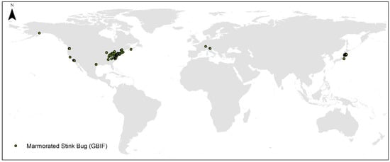 - Zhu, G.; Bu, W.; Gao, Y.; Liu, G. Potential geographic distribution of brown marmorated stink bug invasion (Halyomorpha halys). PLoS ONE 2012, 7, e31246. [Google Scholar] [CrossRef] [PubMed]