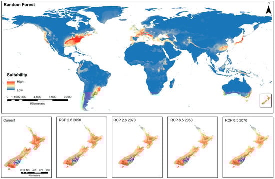 The spatial distribution model using Maxent for current global distribution (Figure 4) shows similar regional distribution of high suitability but a reduced global range of suitability compared with the RF and SVM models (Figure 2 and Figure 3). Similarly, with New Zealand, this model under current conditions appears to show marked reduction on environmental suitability with only areas in South Island showing high suitability compared with the other two models (Figure 4). Addition of climate change projections appear to reduce environmental suitability in North Island and increase suitability in South Island, particularly Southland, with increasing emissions projection and time (Figure 4).