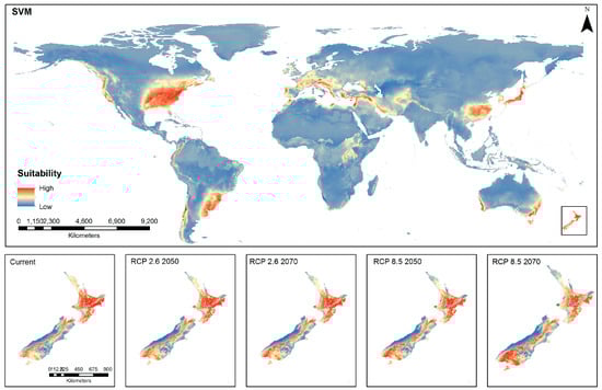 The spatial distribution model using SVM for the current global distribution (Figure 3) shows similar areas of high suitability as those shown by the RF model (Figure 2), although there appears to be the presence of a diffuse pattern of moderate suitability across much of the globe with this SVM model. In New Zealand, under current conditions, high environmental suitability for BMSB is shown over a considerable proportion of North Island and a band running down the center of South Island. Projections for low and high emissions appear to show a reduction in suitability of the top of North Island and an intensification and increase in suitability in South Island over time (Figure 3).