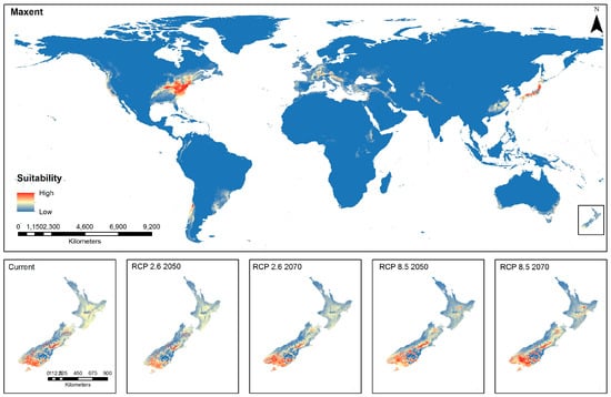 Global and New Zealand predictions of brown marmorated stink bug habitat suitability under current conditions and emissions trajectories of Representative Concentration Pathways (RCP) 2.6 and RCP 8.5 for the years 2050 and 2070 using Maxent algorithm.