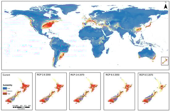 Due to the potential severity of the impact of this species both in terms of plant susceptibility, economic loss, a nuisance to human society, and the increase in New Zealand border detection of BMSB, it is important to determine the potential suitable environmental range in New Zealand. This situation is of greater concern under the influence of climate change, whereby the environmental suitable is expected to increase across the country [29,30,31,32]. This study aims to determine the potential global and New Zealand distribution of BMSB under current climatic conditions and future environmental suitability under the influence of two climate change scenarios; low (Representative Concentration Pathways, RCP, 2.6) and high (RCP 8.5) greenhouse gas emissions for both 2050 and 2070. This will highlight the extent of the potential problem, indicate the risk of invasion, and support the management for prevention of entry, as well as its future regional and national management if this destructive species become established in New Zealand.
