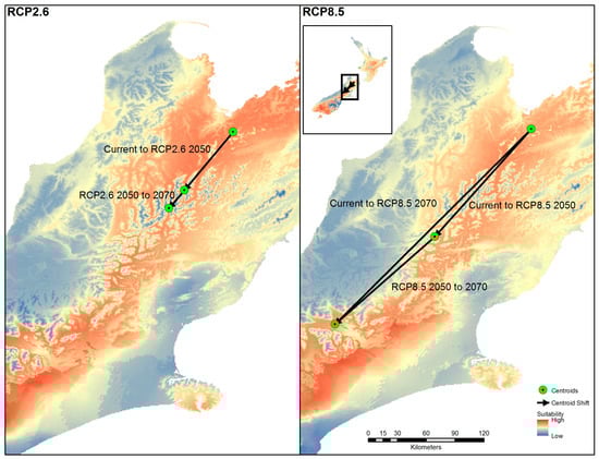 Centroid shift for Representative Concentration Pathways (RCP) 2.5 and RCP 8.5 from current times to the years 2050 and 2070 using the centroid of reclassified High suitability category areas.