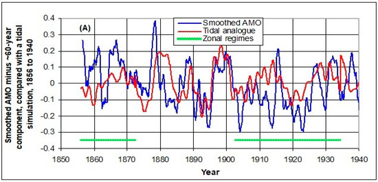 The exogenous tidal mechanism should be essentially unchanged over centuries. The cosine components enable the analog to be projected into the past and future, as shown. The tidal turning points in Figure 1 occur in the mid-years of 1845, 1872, 1902, 1934, 1966, 1997 and 2026. The rising and falling segments of the two curves define zonal and meridional regimes respectively. The zonal-minus-meridional difference appears to be important, and implies an opposition between forces in the two orthogonal directions.