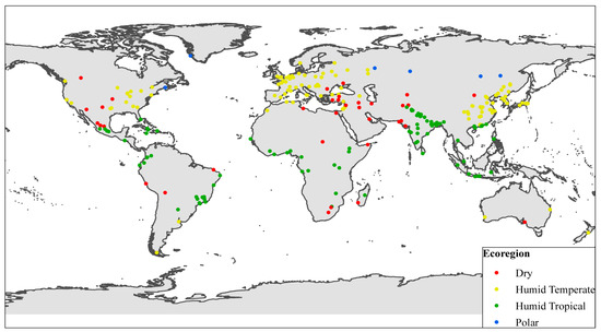Figure 1. Geographical distribution of SHUE cities and their classification with regard to ecoregion domain.
