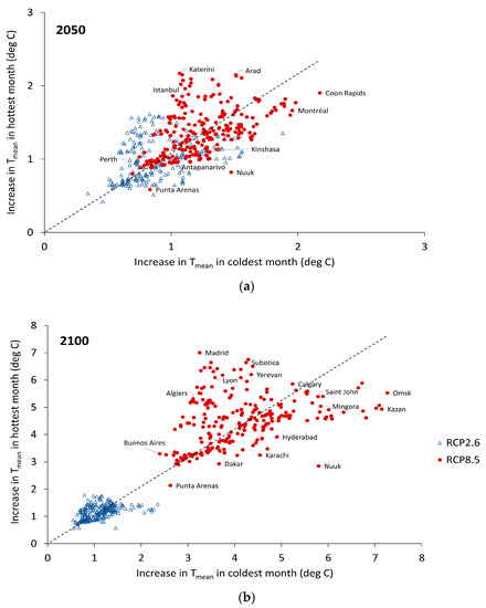 Increase in Tmean in the hottest month vs. in the coldest month (relative to 2017) under RCP2.6 (blue open triangles) and RCP8.5 (red dots) by: (a) the year 2050 and (b) the year 2100.