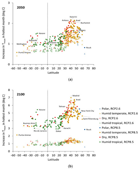 However, the variation in temperature increases with regard to latitude and ecoregion domain may also indicate different implications for adaptation responses. Although cities in low latitude tropical climates generally had more modest increases in Tmean for the hottest month, these cities also tend to have high humidity and small diurnal and seasonal variations in temperature. The combination of heat and humidity (as reflected by high wet bulb globe temperatures and similar indices) presents a particular physiological stress [24,25] that may be greater than that generated by higher but drier ambient temperatures. Also, in tropical climates there is usually limited nocturnal relief. In contrast, the cities in temperate and dry climates with larger potential temperature increases have much greater diurnal and seasonal variation in both temperatures and humidity, which offer potential options to help control indoor environments through the buffering effect of thermal mass [26], or to differentiate activities across the year to reduce exposure to the harshest temperatures for outdoor workers [27].