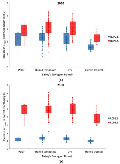 Increases in Tmean in the hottest month under RCP2.6 (blue) and RCP8.5 (red) relative to 2017 for cities in different Bailey’s ecoregion domains by: (a) the year 2050 and (b) the year 2100.