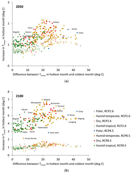 Figure 5 shows the generally inverse relationship between the increase in Tmean and the winter–summer differences in temperature as reflected by the difference in Tmean of the hottest and coldest months of the year. The figure demonstrates the considerable challenges for adaptation faced by cities that experience substantial warming during the hottest month of the year yet also extremely cold wintertime conditions.