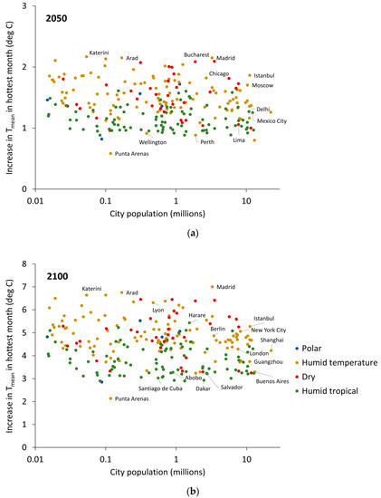 Increase in Tmean in the hottest month by 2100 (relative to 2017) under RCP8.5 vs. city population size (log scale) by (a) the year 2050 and (b) the year 2100. Colouring indicates Bailey’s ecoregion domain.