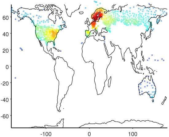 Locations of Daily Global Historical Climatology Network (GHCN-Daily) stations used. ‘Hotter’ marker colors denote locally higher station density.