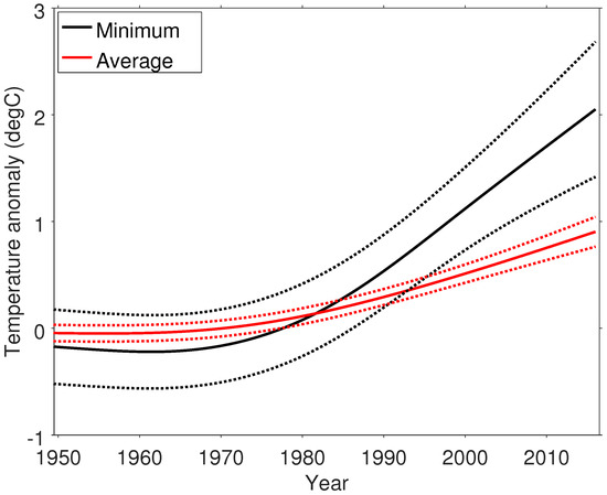 In this study, available weather stations show a trend towards faster warming in annual minimum temperature compared to that of mean temperature. In general, global studies of surface temperatures have found daily minimum temperatures to be increasing faster than daily maximums and winter temperatures to be increasing faster than summer temperatures, resulting in reduced diurnal and seasonal temperature ranges [24,25,26,27]. The most recent Intergovernmental Panel on Climate Change report concluded with medium confidence that globally, daily minimum temperatures have increased more than daily maximum temperatures since 1950 [28]. A study of European station data found that, in the winter, the coldest percentiles of the temperature distribution have been increasing in temperature the fastest since 1950, although the temperatures of the hottest summer days have increased faster than those of the coolest ones [29].