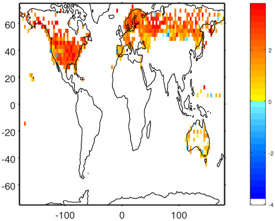 Years were taken to begin in March, so that Northern Hemisphere winters are not split across two years. Only stations with mostly complete years of daily maximum and minimum temperature data since 1970 (i.e., at least 24 years), including at least one of the most recent 5 years (2012–2016), were used. This gave 1428 available stations. Most (1049 stations or 71%) were in the Northern Hemisphere midlatitudes (30°–60° N), split evenly between the Western and Eastern Hemispheres (505 and 544 stations respectively). Station density was the highest in North America, Europe, and Northern Asia (Figure 1). All years with at least 50 available stations were included in the analysis steps.