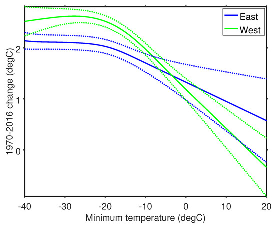 Mean warming in annual minimum temperature over 1970–2016, as a function of climatology (1976–2005) using annual minimum temperature, calculated separately for the Eastern and Western Hemisphere midlatitudes. Dashed lines show 95% confidence intervals of the smoothed relationships.