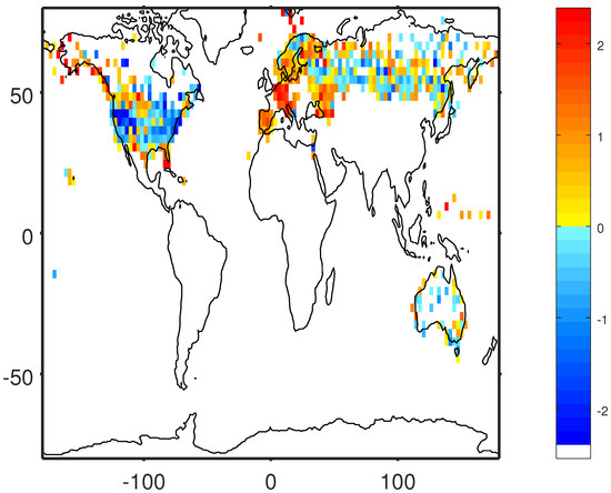 An imputation method based on singular value decomposition [17,18] was used to fill in missing annual values for the selected stations, in order to minimize the impact of changing station coverage over time in terms of the estimated regional trends [5]. Estimates of changes in expected minimum and mean annual temperatures since 1970 were obtained by smoothing splines applied to the temperature time series. The degree of smoothing was chosen to optimize the corrected Akaike information criterion, which provides an indication of the expected prediction error from the constructed spline function [5,19,20,21]. Confidence intervals for the smoothing splines were also obtained [22,23]. Average values and trends were averaged across all stations. Imputation and averaging were also carried out separately for the northern midlatitude (30°–60° N), the Eastern and Western Hemispheres, and for the region of Eastern North America (35°–50° N, 60°–90° W) that has experienced several recent cold winters. Mean warming amounts were also assessed across stations as functions of baseline climatology (1976–2005) using minimum and mean temperatures in order to compare the amount of warming over areas with different levels of winter severity.