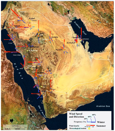 Locations of 14 weather stations in Saudi Arabia included in the current study. The arrows in red and blue colors show the wind directions in summer and winter respectively. Central region (Riyadh, Unaizah); North region (Hail, Al-Jouf and Tabouk); Southwest region (Abha, Al-Baha and Jazan); Eastern region (Dammam and Al-Hofuf); and Western region (Jeddah, Taif, Makkah and Al-Madinah).