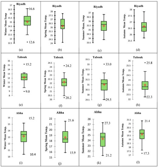 Box plots of mean temperature for different seasons in Riyadh, Tabouk and Abha representing the central, north and southwest regions of Saudi Arabia. (a–d) winter, spring, summer and autumn in Riyadh respectively. (e–h) winter, spring, summer and autumn in Tabouk respectively. (i–l) winter, spring, summer and autumn in Abha respectively. Bottom and top of the boxes represent the first quartile (Q1) and the third quartile (Q3) respectively. The lower whisker extends up to (Q1 − 1.5 × (Q3 − Q1)) and upper whisker extends up to (Q3 + 1.5 × (Q3 − Q1)). The horizontal lines within the box represent the medians of the data. Values larger than Q3 or smaller than Q1 by at least 1.5 times the interquartile range (IQR) are outliers. The (+) sign indicates the mean values of the data.