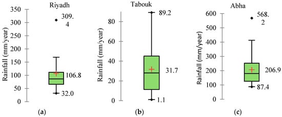 Box plots of rainfall for Riyadh (a), Tabouk (b) and Abha (c) representing the central, north and southwest regions. Bottom and top of the boxes represent the first quartile (Q1) and the third quartile (Q3) respectively. The lower whisker extends up to (Q1 − 1.5 × (Q3 − Q1)) and upper whisker extends up to (Q3 + 1.5 × (Q3 − Q1)). The horizontal lines within the box represent the medians of the data. Values larger than Q3 or smaller than Q1 by at least 1.5 times the interquartile range (IQR) are outliers. The (+) sign indicates the mean values of the data.
